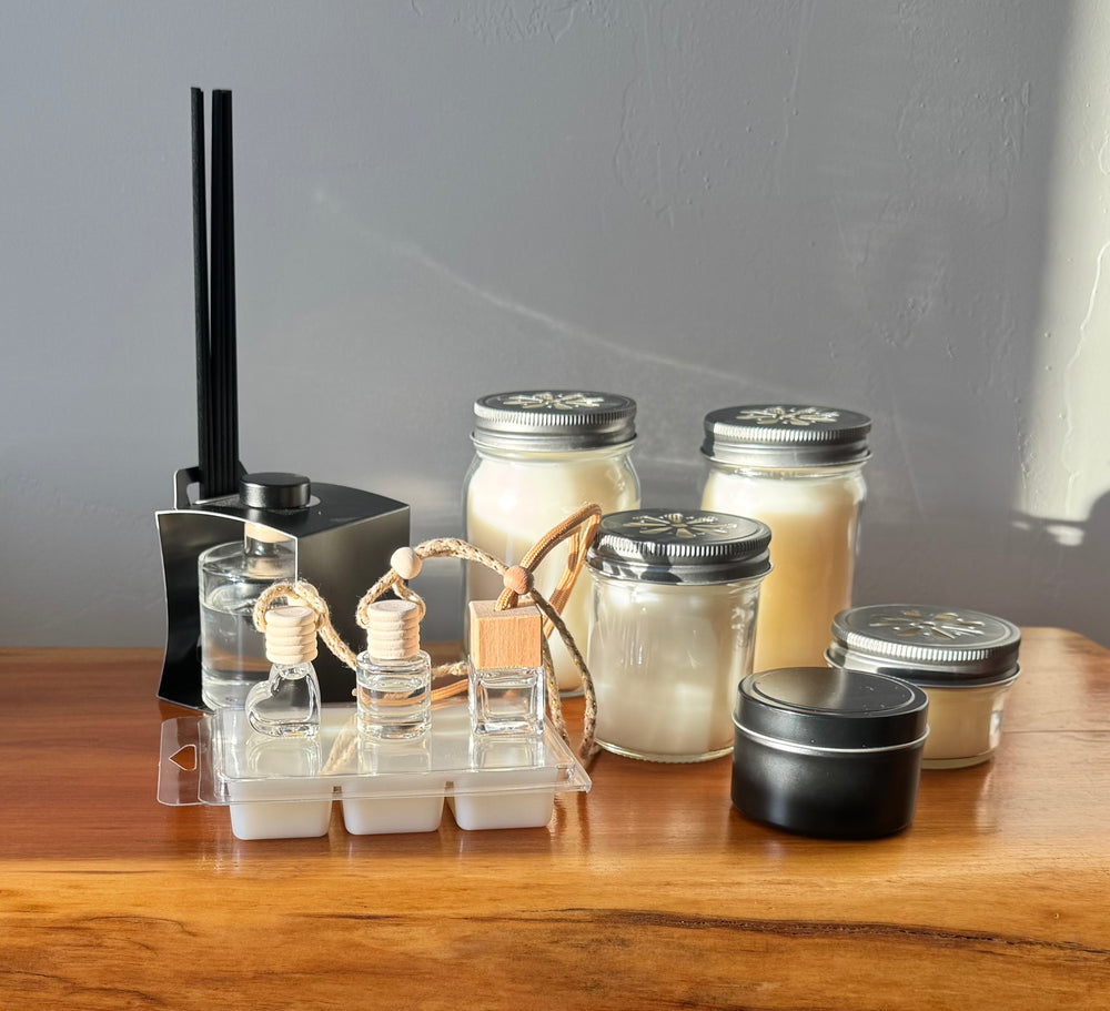 Soy-based wax, cotton wicks, clean fragrances using little to no plastic products
